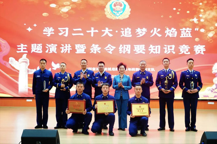 此次活動采取現(xiàn)場演講和知識競賽的形式進行。在黨的二十大精神暨條令綱要知識競賽環(huán)節(jié),由訓保支隊機關、新訓大隊組成的5個參賽隊,圍繞黨的二十大精神知識點、條令綱要內容,通過必答、搶答、風險、加賽四個競賽環(huán)節(jié)進行角逐。賽場上,選手們精神飽滿、團結協(xié)作、沉著應答,活動現(xiàn)場氣氛緊張活躍、扣人心弦,引來了場下觀眾陣陣掌聲。在主題演講環(huán)節(jié)中,5名參賽隊員緊扣主題,結合學習黨的二十大精神所思所悟,從身邊人、身邊事講起,用一個個扣人心弦的感人故事、一幕幕赴湯蹈火的戰(zhàn)斗場景、一句句感人肺腑的質樸話語,真情講述了消防救援隊伍竭誠為民的初心使命,充分展現(xiàn)了新時代消防救援隊伍的嶄新風貌!最后,通過激烈的爭奪,四中隊、三中隊、一中隊分別榮獲知識競賽第一名、第二名、第三名,蔣傳玉、劉麟、吳潔熠分別榮獲主題演講冠軍、亞軍、季軍。